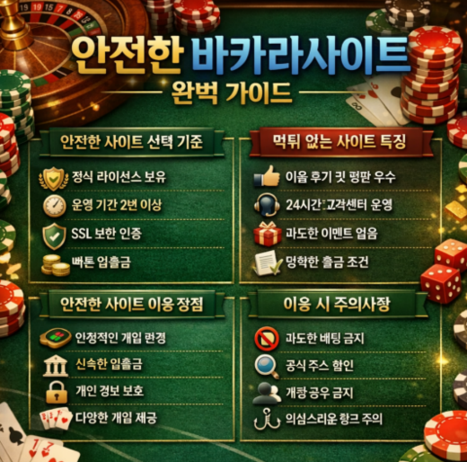 온라인 카지노사이트 시장이 성장하면서 안전한 바카라사이트 를 찾는 이용자들이 크게 증가하고 있습니다. 하지만 수많은 온라인 바카라사이트 중에는 신뢰할 수 없는 바카라먹튀사이트 도 많기 때문에, 이용 전 반드시 바카라먹튀검증 이 필요합니다. 본 글에서는 안전한 바카라사이트 를 선택하는 기준과 주의사항을 자세히 안내드립니다.